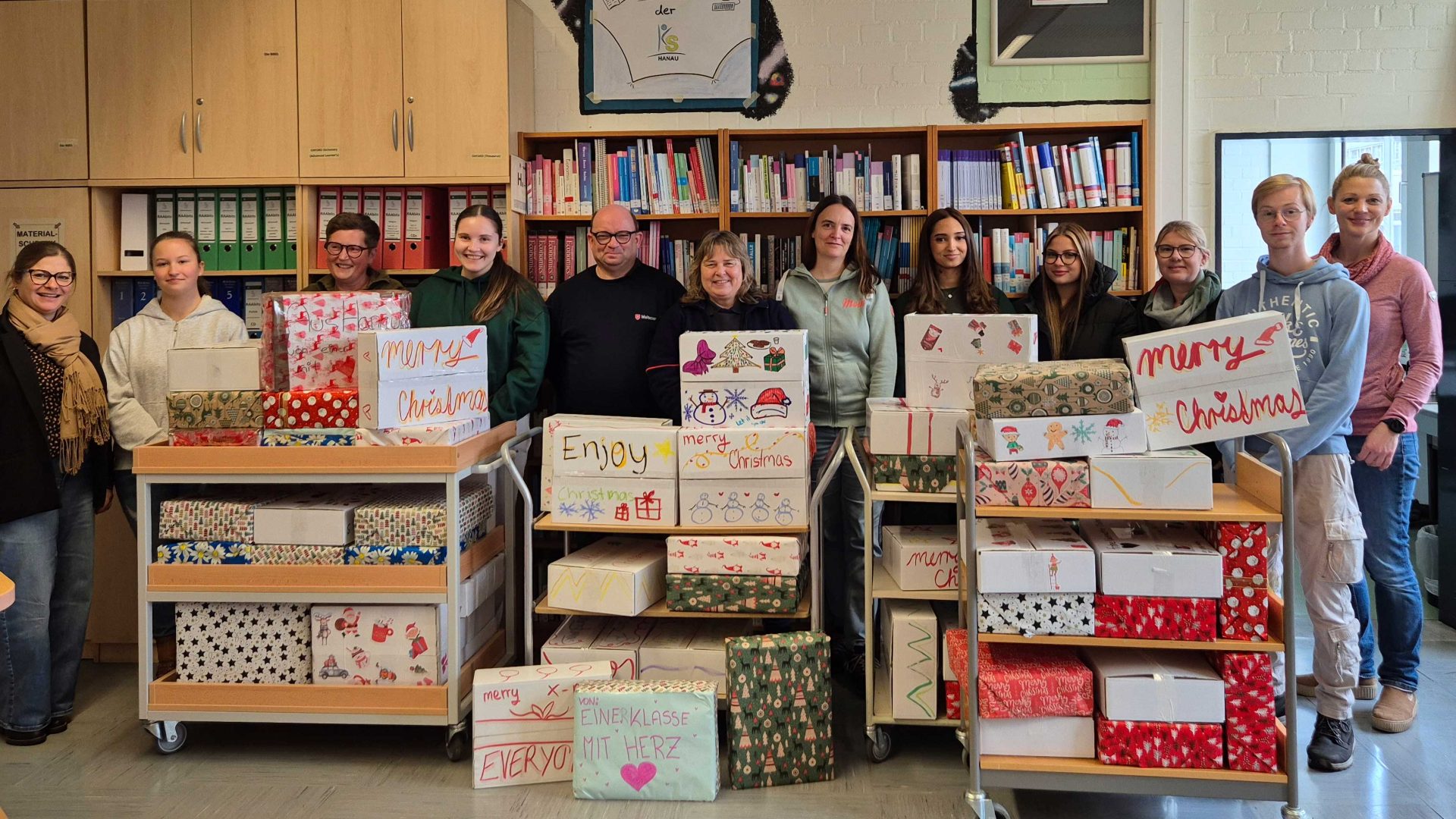 76 Päckchen konnten die Kaufmännischen Schulen Hanau am 20. November 2025 an die Malteser übergeben. Das sind 16 mehr als das letzte Jahr! „Somit gehören sie schon fast zu den Spitzenspendern!“, meinte Herr Stichel von den Maltesern. Und dieses großartige Ergebnis zeigt, dass die Schülerinnen und Schüler der KSH Herz zeigen und sie die Not von bedürftigen Menschen aktiv lindern wollen. „2 Euro hat man doch immer übrig“, meinte eine Schülerin aus dem Beruflichen Gymnasium. Die Päckchen werden von den Maltesern in den Norden Rumäniens gefahren und dort an bedürftige Familien, ältere Menschen und Menschen mit Behinderung verteilt. Herr Stichel von den Maltesern lobte die rumänische Organisation vor Ort, auf die er sich hundertprozentig verlassen könnte.